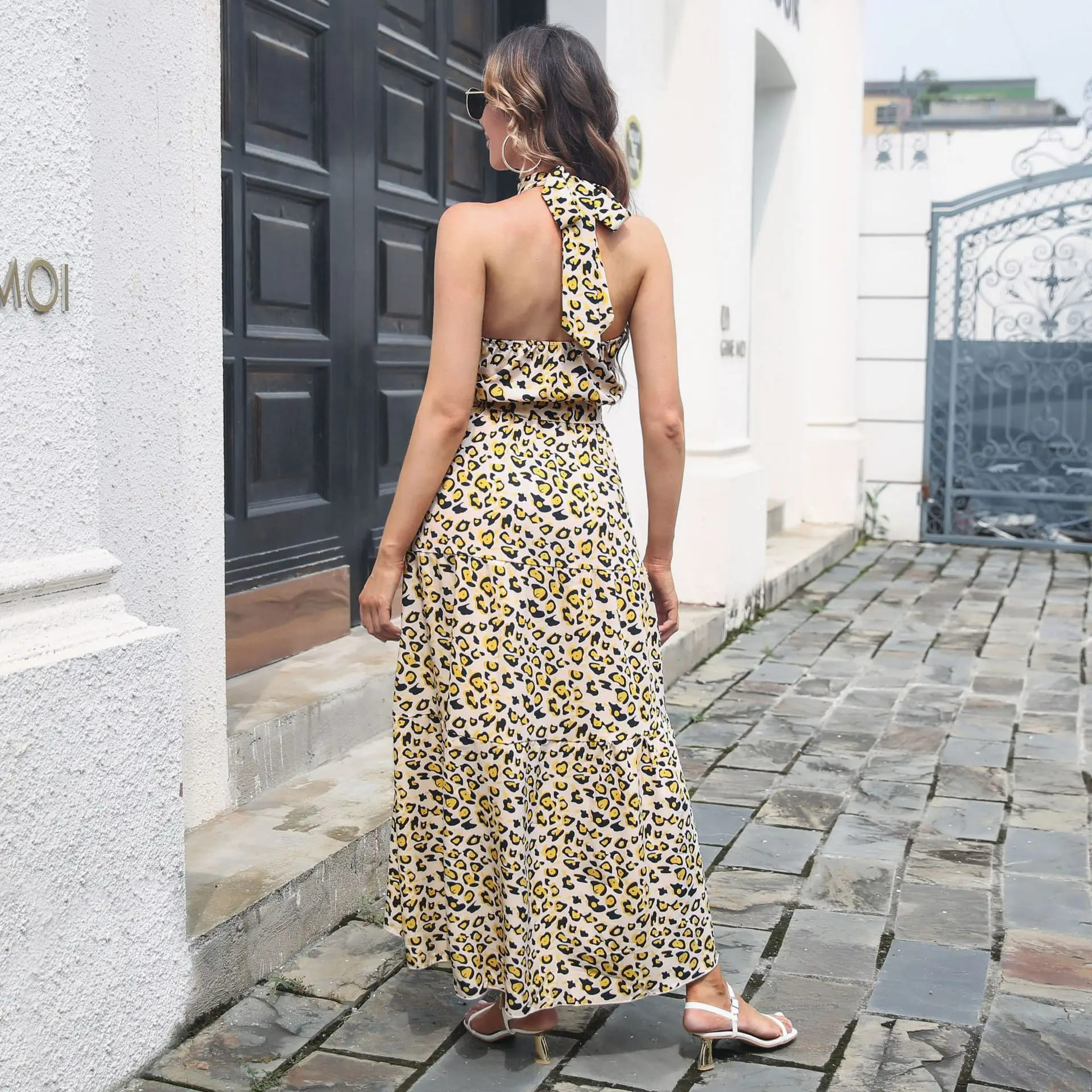 La robe longue léopard dos nu est un choix élégant et audacieux pour les occasions spéciales. Fabriquée en mousseline de soie légère, cette robe présente un imprimé léopard tendance qui est sûr de faire tourner les têtes. Le dos nu et l’encolure licou à lacets ajoutent une touche de sensualité à cette tenue à la fois glamour et sophistiquée.